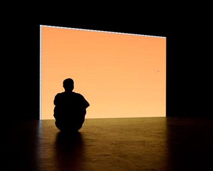 Digital sunset based on a custom gradient. The screening shows a record of the computer screen while a scroll into the file simulates the sunset effect. This projection enlightens and colors the room while, gradually, plunges its visitors into the dark.